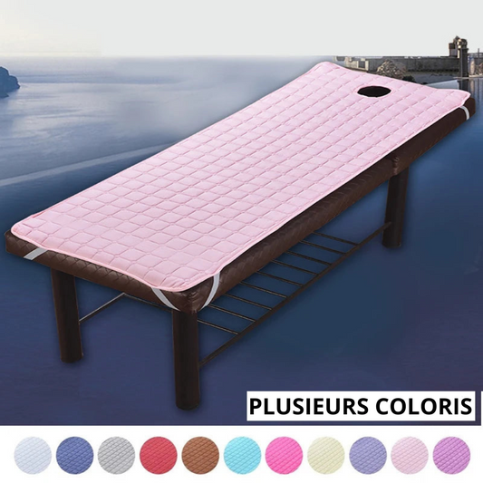 Chez Soin & Relaxation, nous vendons la meilleure qualité de textile de parure pour votre table de massage en tissu éponge avec ou sans trou visage. Si vous utilisez une têtière sur votre table de massage, nous avons des housses pour votre matelas qui ont un trou au niveau du visage pour le confort de votre patient. Dans tous les cas, nous avons une housse qui s’adaptera à vos besoins. Nos housses pour table de massage en tissu pur coton se lavent avec votre linge de maison. Votre housse lavable est un protège matelas imperméable pour votre table de massage.